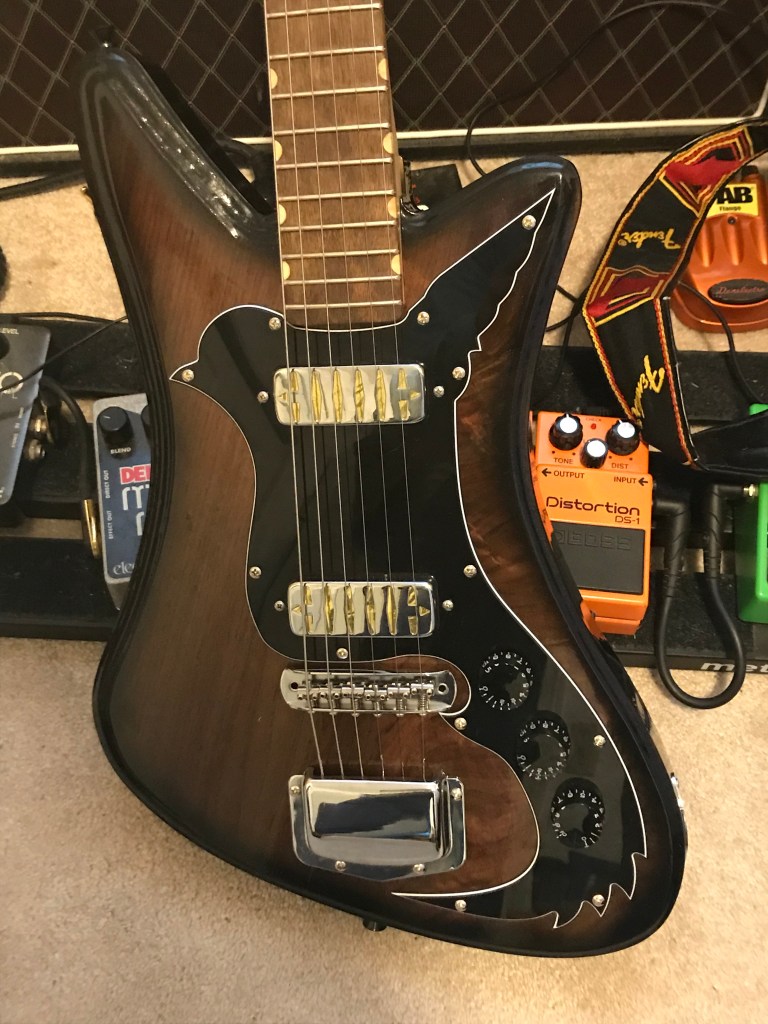 The clear finish they put on these guitars is perfect because the wood they use is just naturally gorgeous. The Silver Poplar and Walnut top have this beautiful, natural grain that just looks super unique, and gives the guitar a rustic look. It’s definitely a really cool looking guitar to have on your wall or in your studio that even non-musician’s would appreciate. Besides the good looks, the guitar is just built well. It’s incredibly small and light, really deceptively small from the images. But that makes it incredibly comfortable to play sitting down or standing up. The hot pickups and light weight make it especially interesting to me for live rock shows and I would love to take this on the road for a nice Black Keys cover or two. The finish looks good, everything is screwed or wired in well, and the guitar doesn’t have a ton of buzz like I thought it would.