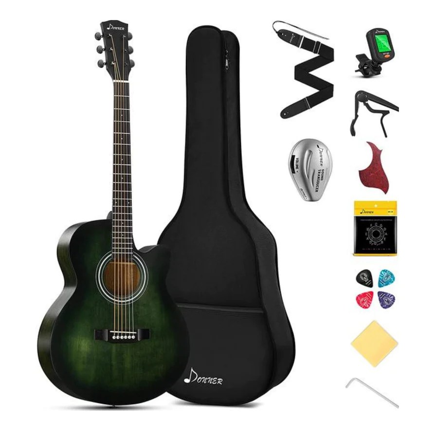 What we’re talking about here is essentially an excellent starter pack for anyone interested in acoustic guitar. With a case, strap, picks, clip-on tuner, capo, and even a pickup for electrifying the acoustic guitar, you have everything you need in one, affordable package. Furthermore, the DAJ-110 CD features a nice cutaway, for easier access to the higher frets. A huge plus for either the beginner or pro guitarist. Currently, you can get this DAJ-110CD package on Amazon or Donner’s own website for around $125, making it one of the most affordable acoustic options on the market.