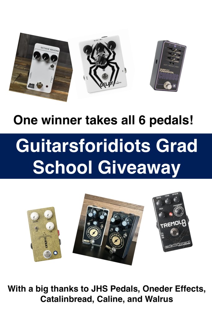 So to celebrate I’m giving away 6 pedals, a pedalboard sized bounty for one lucky winner to build their own guitar or bass rig around. To enter, head over to my Instagram page and like the post announcing the giveaway. You also have to be following myself, JHS Pedals, Oneder Effects and Catalinbread on Instagram to be eligible for the prize.