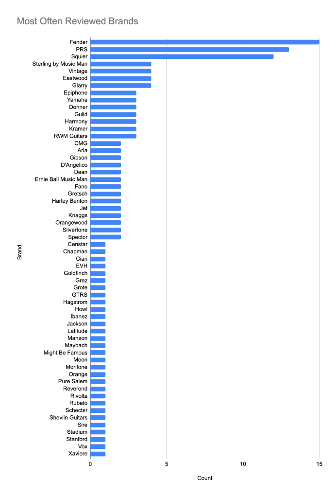 Well the other day I got curious about just how much gear I have shared my thoughts, feelings, and opinions about. It was an exhaustive effort digging into my notes, as well as scouring the history of this website and my Ultimate Guitar author page. By my count, I have reviewed 141 guitars from 64 different brands, and 176 pedals from 85 different brands. I’m sure there are others out there who think of those as rookie numbers, but I was pretty taken aback at just how busy I’ve been. If you’re a data nerd like me, then maybe some of these stats and graphs will interest you!