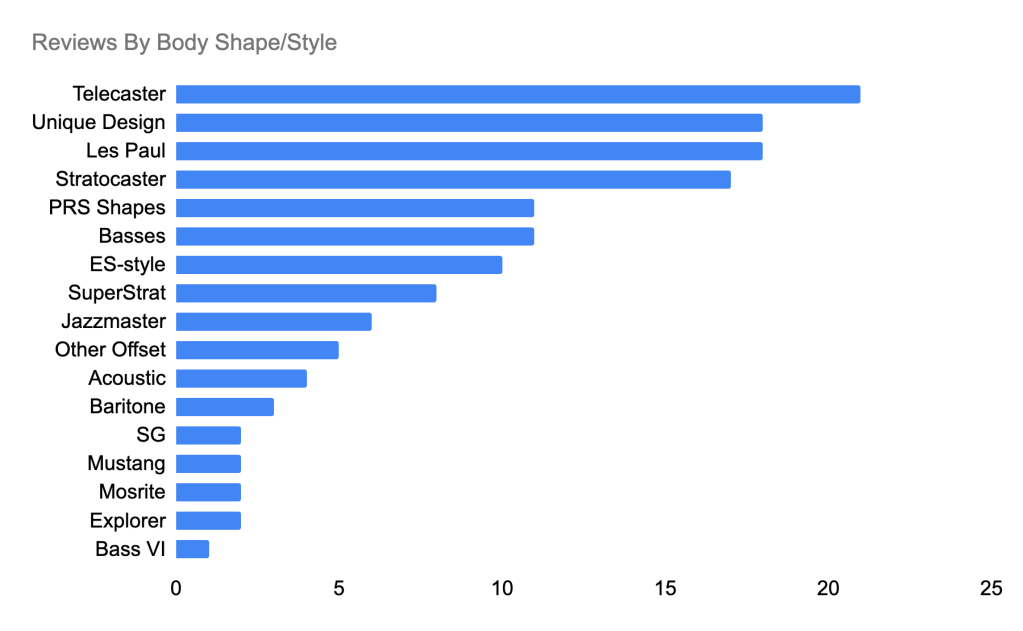 After seeing all of those numbers, what do you think? Too much of a certain brand or design? Sometimes it is hard to avoid that for a number of reasons. Firstly, you have to find brands willing to work with you consistently (thanks Fender, PRS, Summer School, and UAFX!). Secondly, you have to cover gear folks actually want to read about! But I’m super curious to hear what you think?